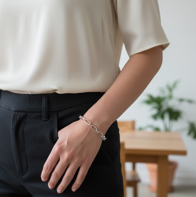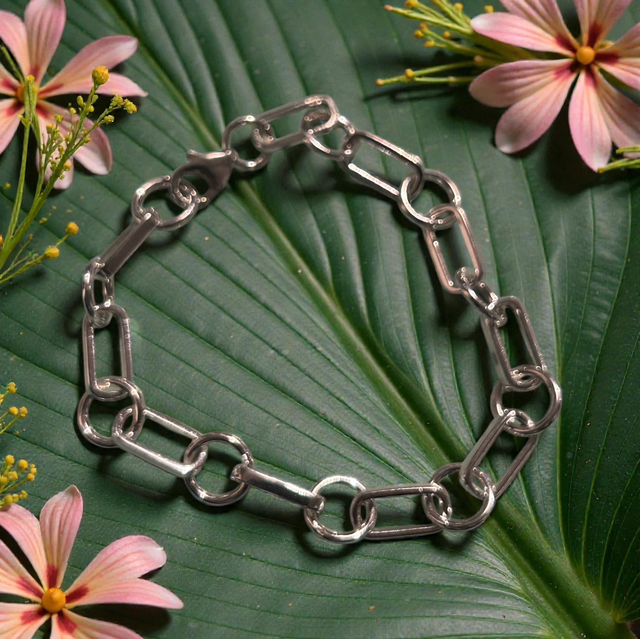 A beautiful bracelet with interlinked rectangles and circles, creating an incredibly easy to wear and flattering piece. Available on a range of sizes.