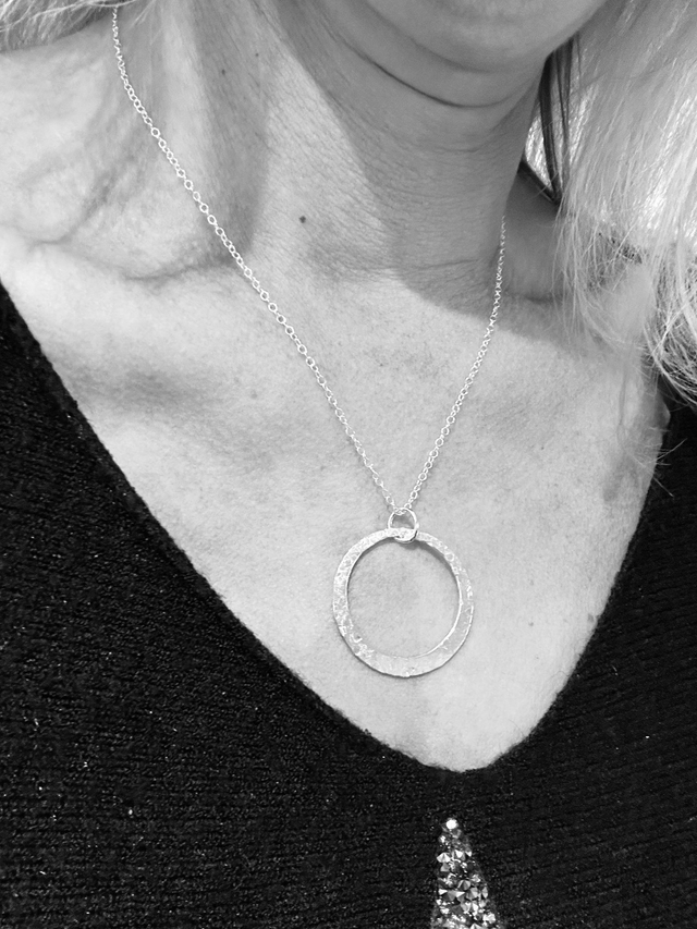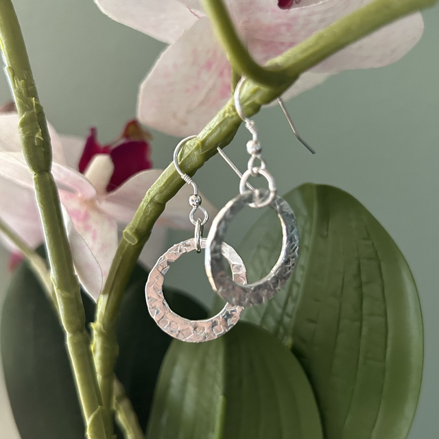A beautifully hand hammered 925 silver disc pendant on an 18" 925 silver chain and a matching pair of silver disc earrings on fine silver hooks. Please note, the pendant is also available on this website as a stand alone piece.