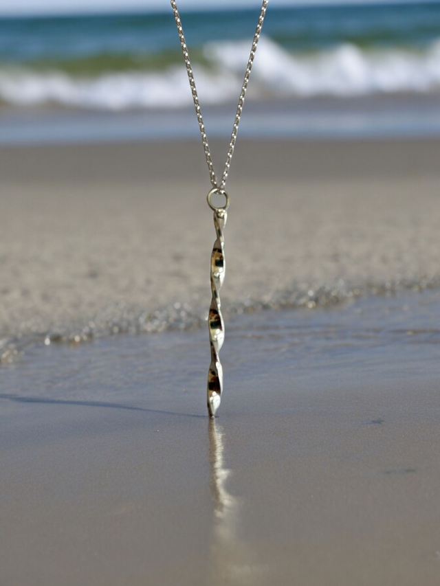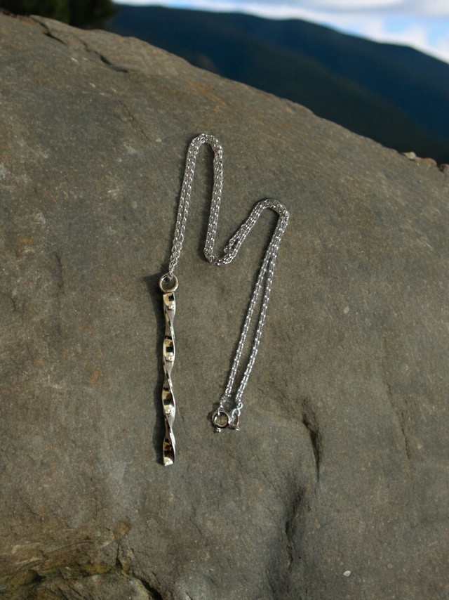 A flat, hand-twisted, 925 silver pendant on an 18" silver chain. This exquisite piece will make you sparkle wherever you are. Matching earrings are available - please order the pendant and earrings from the 'sets' category.