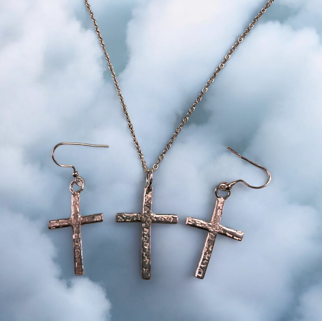 A hammered texture cross pendant and earring set in 3.2mm silver. A beautiful collection to make you sparkle.