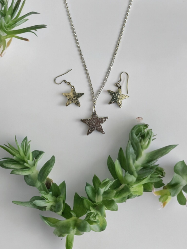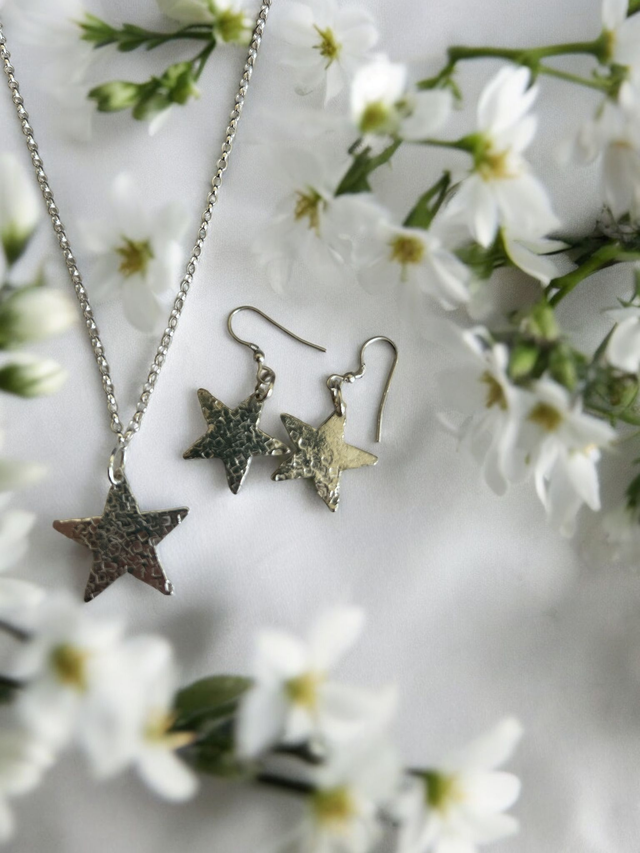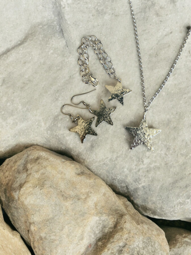 An incredible and special jewellery set made up of a 2.5cm hand-hammered star charm pendant on an 18" belcher chain, a 2cm hammered star on a 5mm silver belcher bracelet (18cm in length) and a pair of marching 2cm hammered star earrings.
