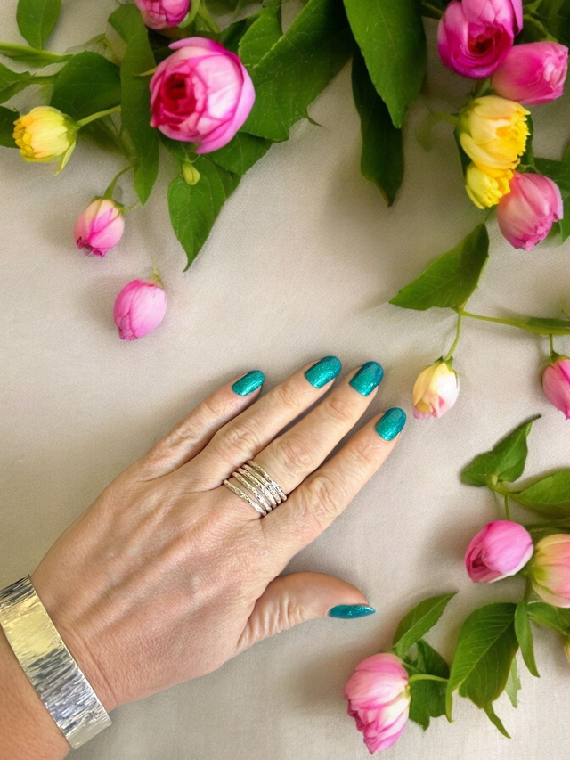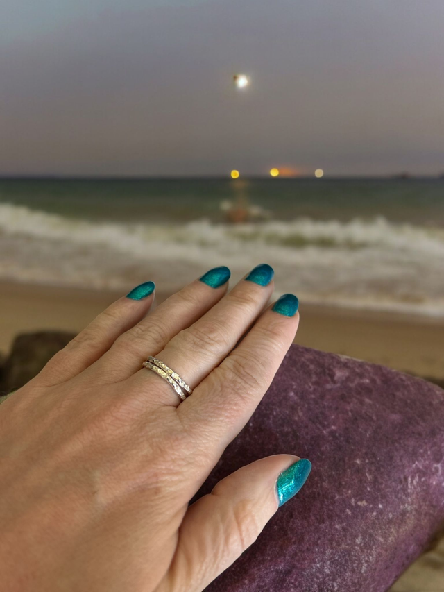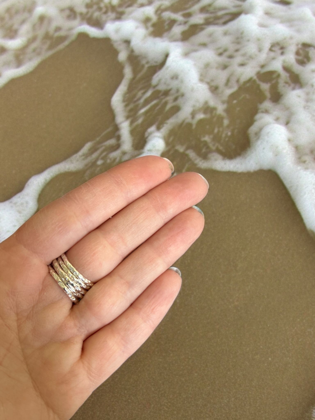 A thin hand-hammered, handmade ring ideal for stacking or wearing individually. This ring is made from a round piece of silver and is easy to wear, versatile and comfortable. Available in a range of sizes (J to Z)